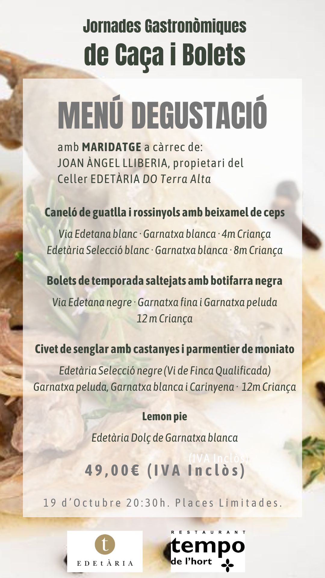 Menú Degustación + Maridaje de la mano de Joan Àngel Lliberia, propietario de la Bodega Edetària DO Terra Alta.